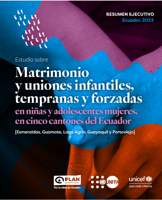El estudio realizado por UNICEF, UNFPA y Plan International en Ecuador indaga en las barreras que enfrentan las niñas y adolescentes mujeres y que las conducen a vivir en uniones tempranas a través de un análisis cuantitativo y cualitativo en cinco cantones del Ecuador. La investigación se realizó en 2022, en los cantones de Guamote, Esmeraldas, Guayaquil, Portoviejo y Lago Agrio de las provincias de Chimborazo, Esmeraldas, Guayas, Manabí y Sucumbíos respectivamente. Se escogieron estas localidades debido a que presentan altos indicadores de esta problemática.